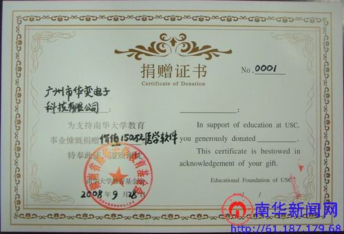 图为捐赠证书