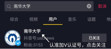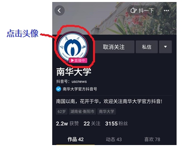 在关注列表找到“南华大学”,点击进入英国上市公司365官方抖音主页,点击头像即可进入直播。