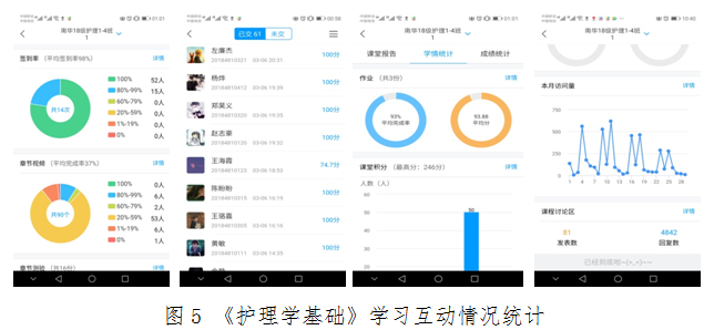 课程组采取过程性评价与总结性评价相结合的考核评价体系,过程性评价(学生在线学习成绩)占总成绩的40%。本学期开课以来,《护理学基础》上课签到率为98%,学生作业完成率为93%,平均分为93.88分;教师累计讨论586次,学生累计讨论4586次;发表讨论话题81个,学生回复4842次。