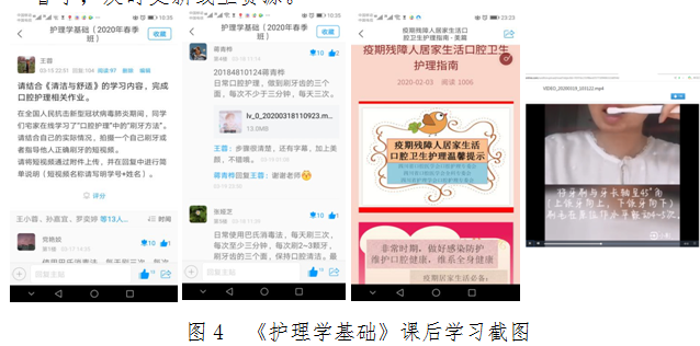 课后,学生在学银在线平台或学习通APP 完成在线测试、主题讨论。学生可反复观看授课视频,或翻看群聊中教师对难点的解答;在课程网站上继续学习相关基础护理操作视频、中英文参考文献等。教师参与在线讨论和点评,对学生进行督学,及时更新线上资源。