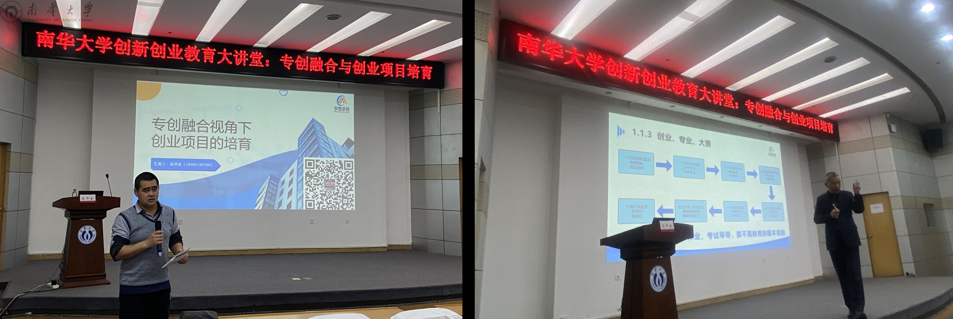 高泽金教授以“专创融合与创业项目培育”为主题,为南华学子作创新创业讲座。他首先向同学们提出为什么要参加比赛和怎么获得高分的问题,在同学们的踊跃回答后,高泽金指出“比赛是为了成长,我们要跳出比赛本身”,并提出学会学习才能更好成长,学习不单是听讲和写题,更重要的是行动和分享。