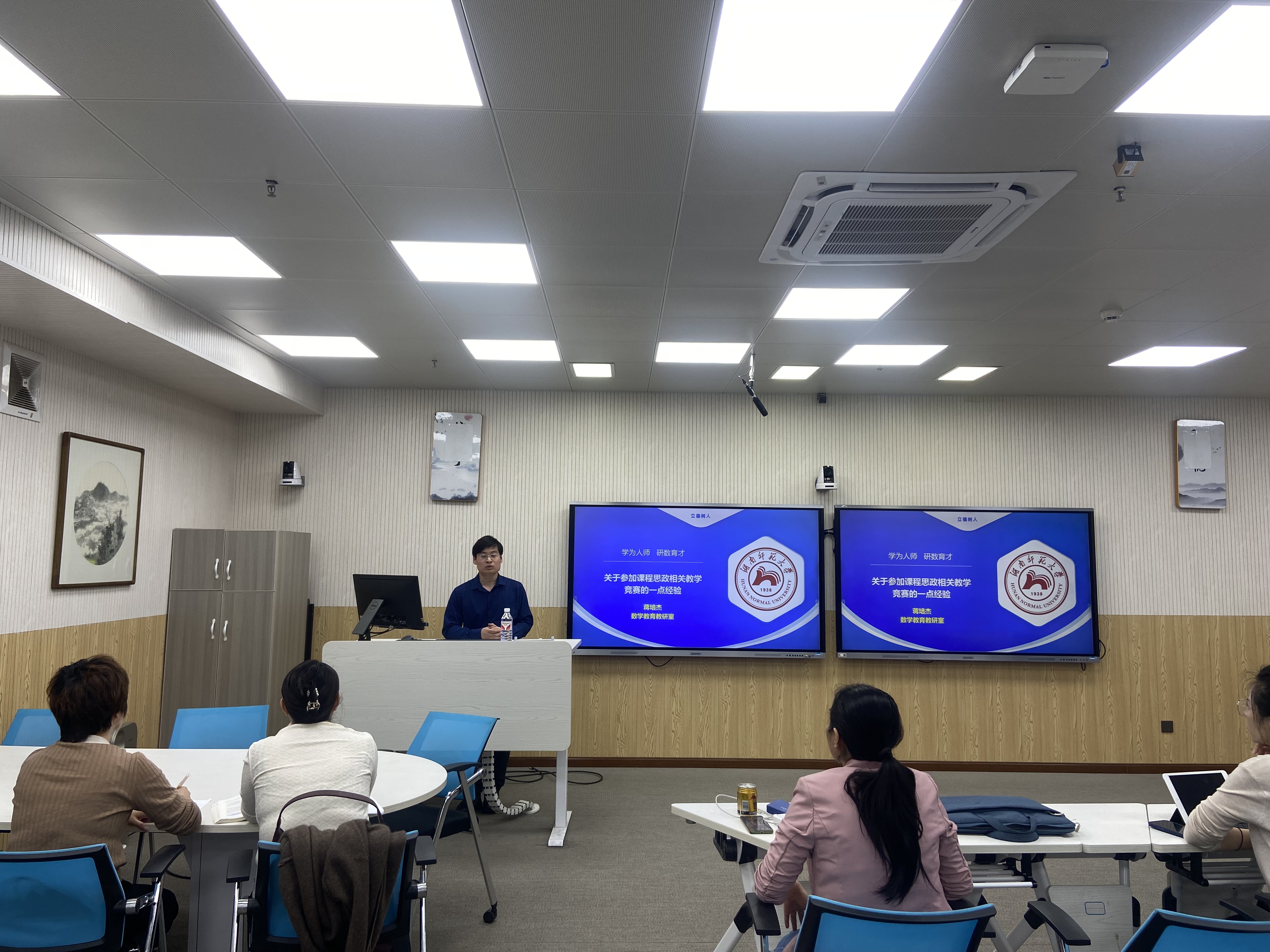 蒋培杰教授首先解读了教育部关于印发《高等学校课程思政建设指导纲要》的通知,结合数学学科特点,解读了《纲要》中“分类推进课程思政建设”的要求。他提到,理工类课程需重点挖掘科学精神、创新意识及家国情怀等元素,避免“贴标签”式的生硬融入。随后,蒋老师分享了自己亲身经历的参赛过程,历经四个阶段的系统锤炼:准备阶段,组建骨干教师团队,对教学设计、案例打磨及语言表达进行精细化调整,学院及学校邀请专家全程跟踪指导,为竞赛奠定坚实基础;投入阶段,全力以赴通过校赛、省复赛层层选拔,才能进入省决赛争取理想成绩;比赛阶段,以《高等数学》课程为依托,通过情境式教学法生动展现知识传授与价值引领的融合实践,最终斩获课程思政组一等奖;反思阶段,赛后系统总结教学经验,深化“以赛促改、以赛促研”理念,将竞赛成果转化为理论成果,推动课程思政从实践探索向体系化建设升级。