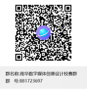 参赛学生在报名截止日期前提交报名表至所在学院,报名表与邮件统一命名为: “学院名称+作品类别+作品名称”,如:“松霖设计艺术学院+B2-1+校内交通工具设计”。请各学院指定1名大赛作品收集负责人,请扫码加入“南华数字媒体创意设计校赛群”QQ群,学院汇总完成后,将汇总表、报名表和作品原件(均按照汇总表排序)一并发至校赛指定邮箱,邮件命名为“学院名称+负责人+联系电话”。如文件过大,可上传至百度网盘,发送链接至QQ群,由校赛指定工作人员下载。