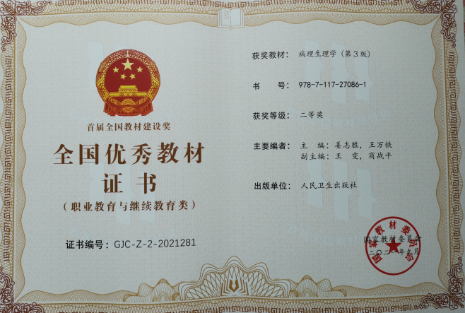 由姜志胜教授主编,人民卫生出版社出版的国家级规划教材---《病理生理学》(第3版)获得首届全国教材建设奖二等奖。
