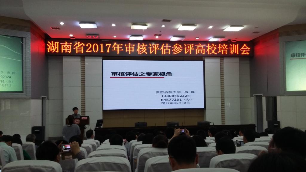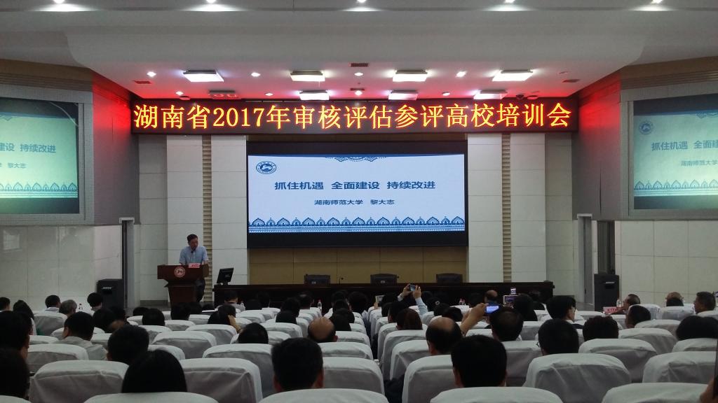2017年5月12日,湖南省2017年审核评估参评高校培训会在湖南师范大学至善讲堂召开。会议由省教育厅高教处主办、湖南师范大学承办,来自省内10余所高校的200余名代表参加会议。我校副校长刘升学带领本科教育教学评估中心、教务处、图书馆及护理学院等14个教学单位的25名教师参加了本次会议。