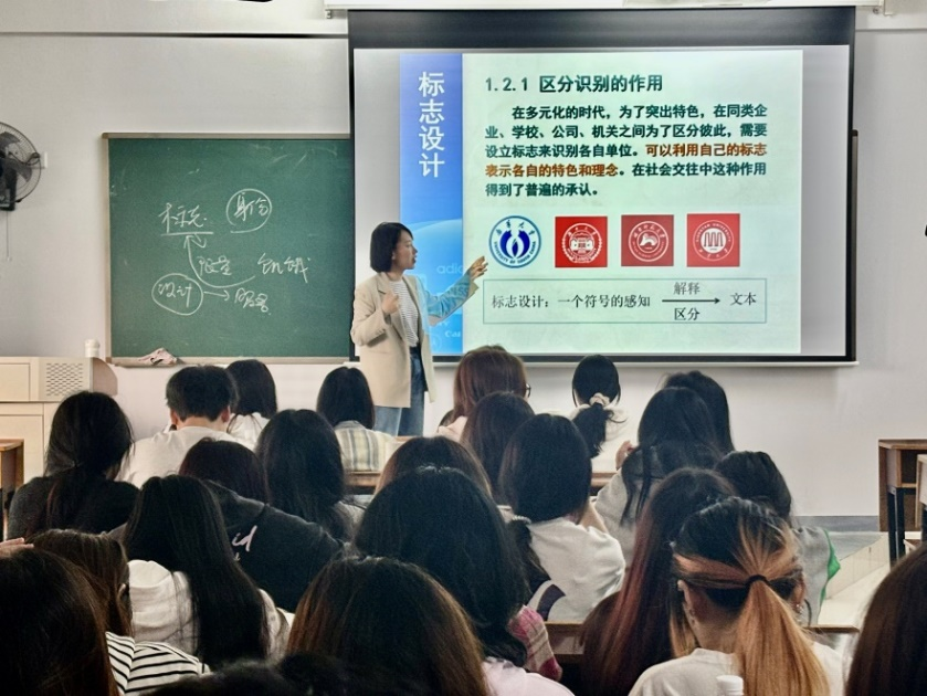 课堂上,邓老师以生动且富有深度的方式,阐释了标志设计的核心要素——简洁性、象征性与文化性,并引导学生探讨如何在设计中融入本土文化基因与社会责任。通过丰富的案例解析和互动讨论,引导学生思考如何通过简约的图形语言传递丰富的品牌信息,极大地激发了学生的创作灵感和学习热情。值得一提的是,老师将专业知识与文化传承、社会责任相结合,鼓励学生立足本土文化,在设计创作中融入中国传统美学元素和当代社会价值观,使标志设计既具有民族特色又能体现时代精神。
