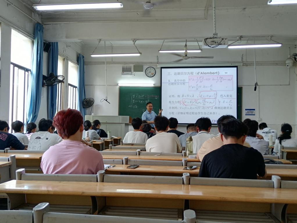 《电动力学》是物理学四大力学之一,研究电磁场的相互作用及其运动规律。该课程涉及的物理过程复杂,数学推导繁琐,是学院核物理专业的核心专业课程。课堂上,李新霞教授围绕着“电磁波的辐射、电磁场的矢势和标势、电磁场的达朗贝尔方程”核心知识点展开,教学过程中充分的融合了板书和多媒体等多种教学手段,并且通过deepseek搜索引擎展示了核物理学科前沿相关的电磁波辐射问题。整个课堂教学中,李老师利用专业而又风趣的教学语言,丰富的肢体语言,将知识诠释得透彻明亮,让学生们对电磁波的辐射有了更加直观的认识,也激发了他们利用掌握的数理知识探索未知、追求真理的热情。
