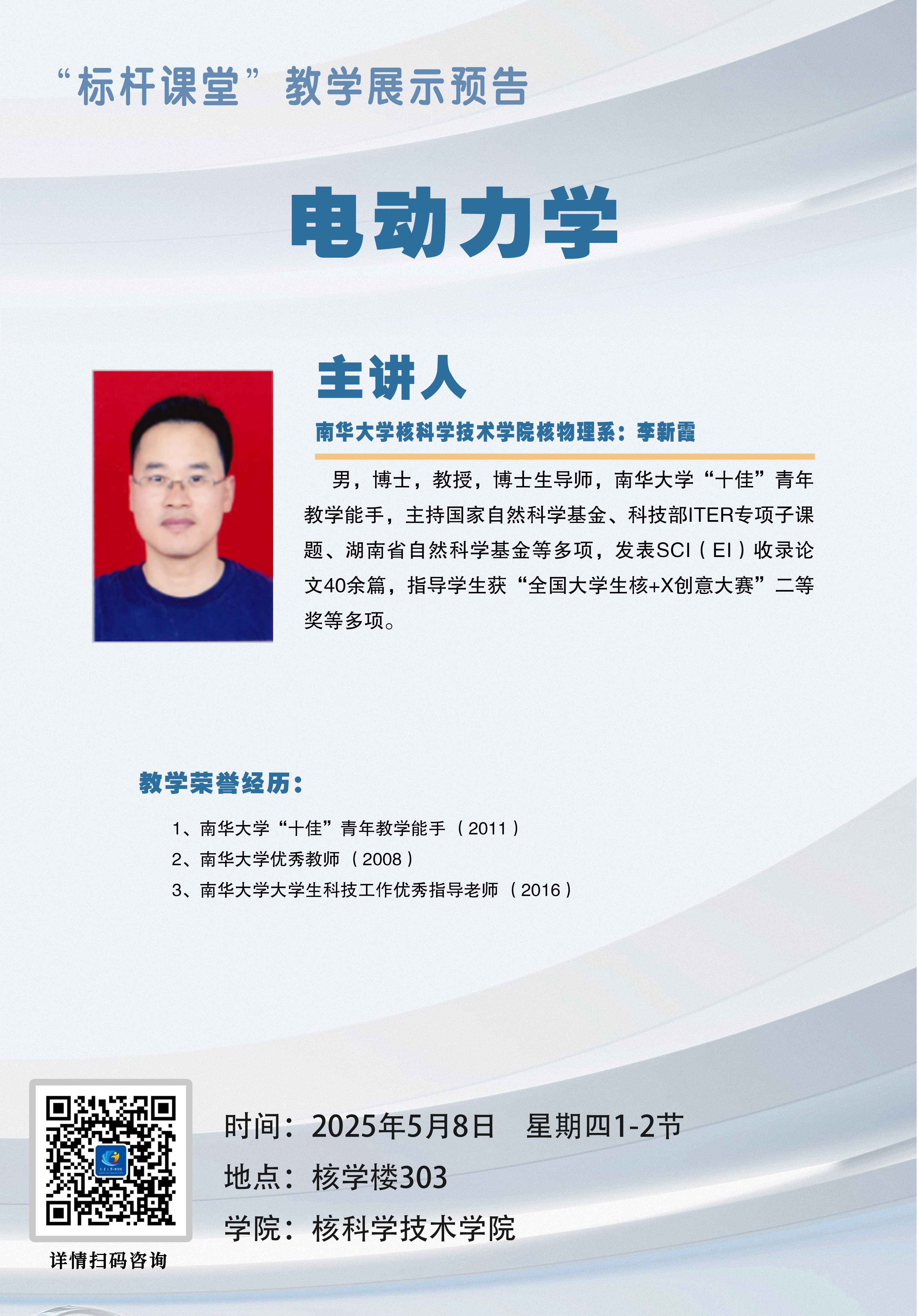 《电动力学》是“核物理”国家一流本科专业核心课程。本课程研究电磁现象的经典动力学理论,通过课程的学习,使学生系统的掌握电磁场的基本规律、稳恒电磁场的基本性质、求解电场和磁场问题的一些基本方法、电磁波的传播和辐射规律、电磁场量在不同参考系间的变换和相对论力学的基本概念,以及带电粒子和电磁场的相互作用。