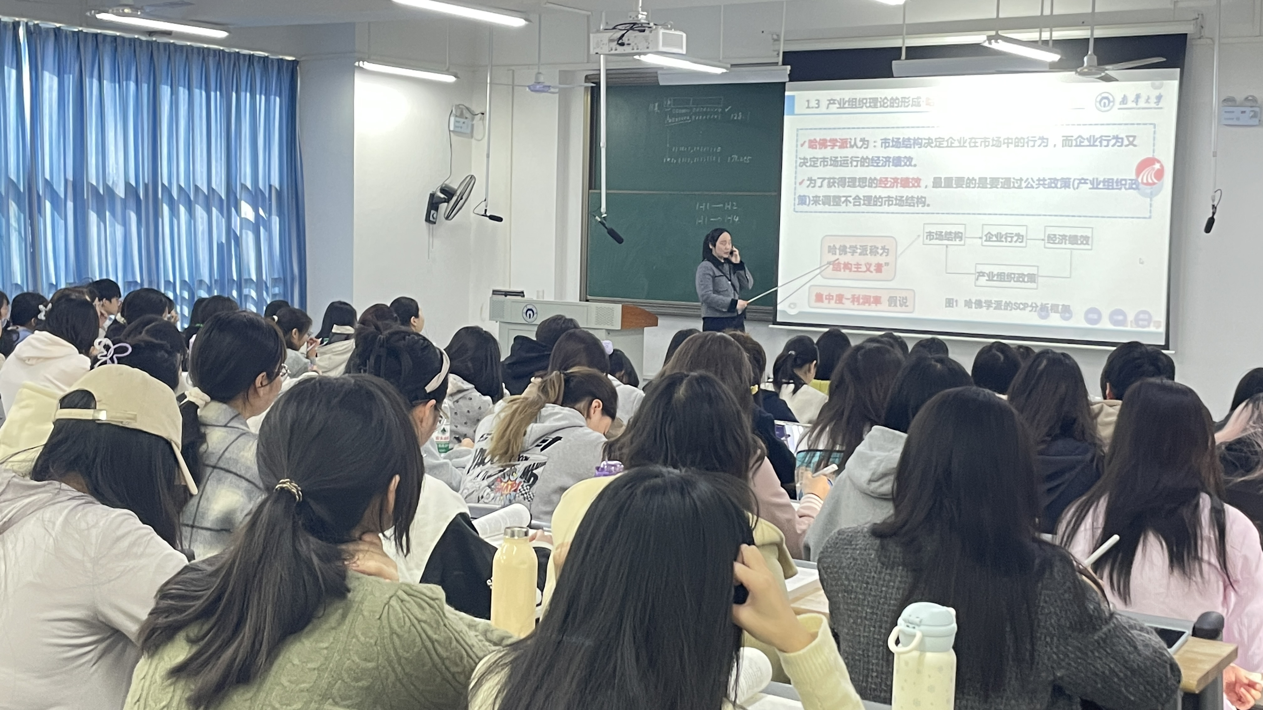 在谭盼老师主讲的《产业经济学》课堂上,处处洋溢着师生互动、教学相长的浓厚氛围。课堂初始,谭盼老师带领学生开启了一场对产业组织理论的溯源探索,她深入剖析 “马歇尔冲突” 的本质,系统梳理哈佛学派与芝加哥学派的理论分歧,并借助详实的数据和直观的图片,生动阐释 SCP 框架助力学生轻松理解抽象概念。在讲解市场结构类型时,谭盼老师巧妙运用启发式教学法,积极引导学生自主思考不同市场的独特特征,选取农产品市场、公用事业等常见行业作为切入点,带领学生深入探究各类市场结构之间的内在联系及差异,让学生在思考与探索中不断深化对知识的理解。