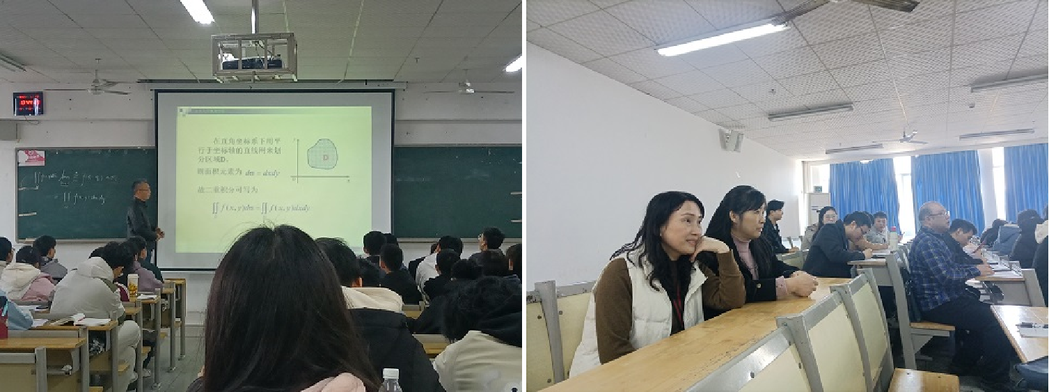 3月20日星期四上午第三节课,数理学院新老教师一行10余人在教学副院长王恒太的带领下,一起走进徐正华老师的高等数学课堂进行观摩和学习,徐老师以“二重积分的定义与性质”为主题,开展了一堂生动而富有启发性的教学。课堂教学中,徐老师展现出了独特的教学风格和深厚的专业素养,令在场的每位师生都深受启发。