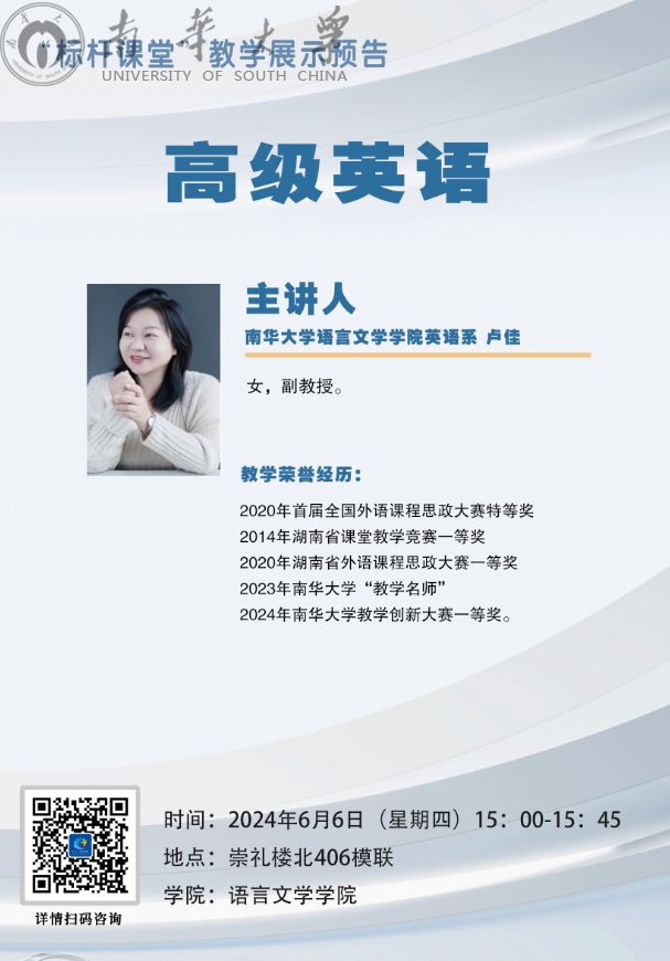《高级英语》是英语类专业学科基础课平台中一门必修课程。本课程立足教材,高于教材。以英语语篇为教学内容,扩充同类型中国文化元素,训练学生语言运用能力、批判性思维能力、培养家国情怀和爱国热情。该课程共计64学时(4学分),目标是培养学生对名篇的分析和欣赏能力、逻辑思维能力、自主学习能力和科研能力,巩固和提高英语语言技能,并为学生进一步向高层次研究方向的发展打好坚实基础。通过各类实践活动,如“用英语讲好中国故事”话剧表演、“乡村振兴”社会支教、翻译实践等,全面提高语言运用能力,提升文化认同感和社会责任感。