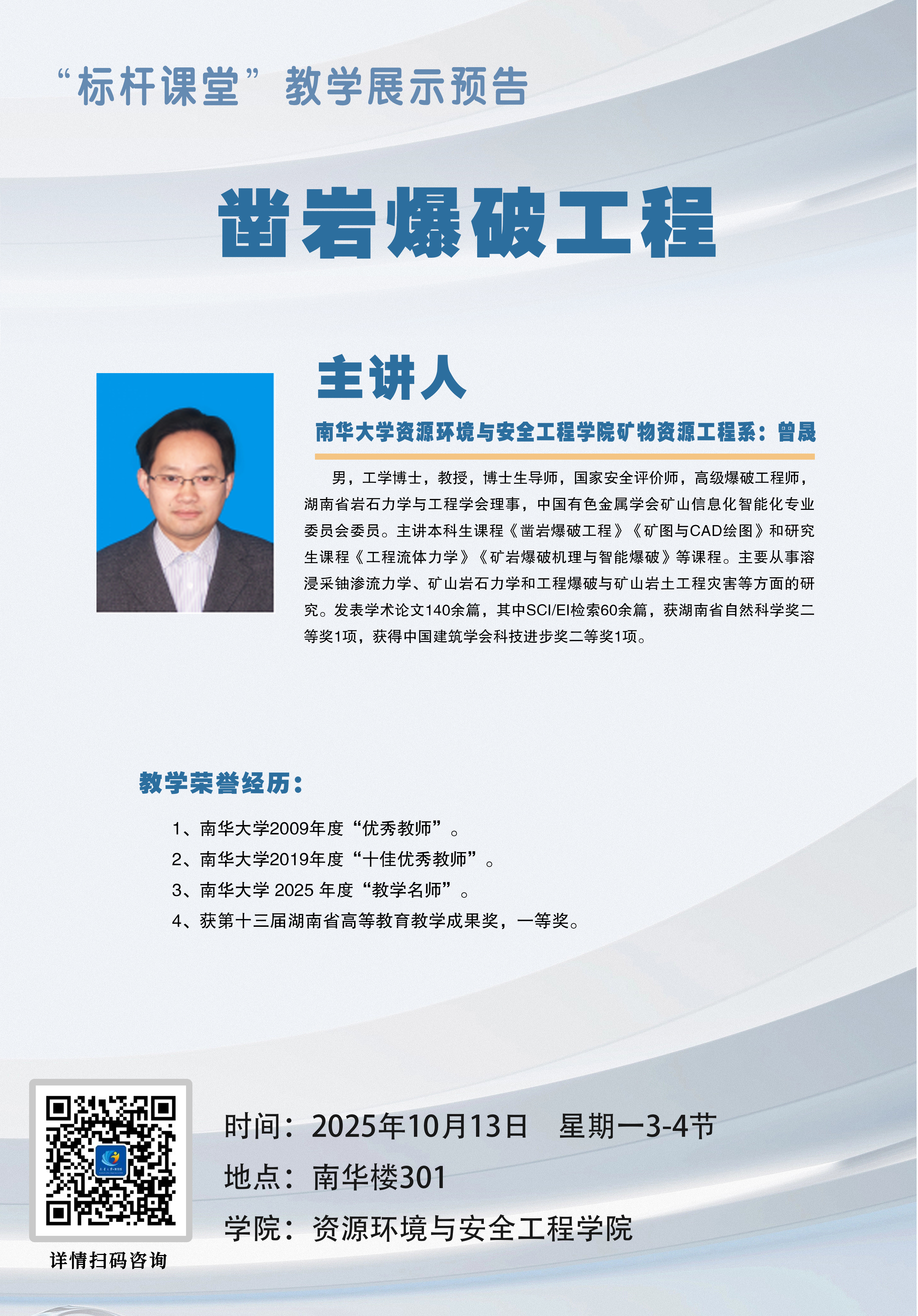 《凿岩爆破工程》是矿物资源工程专业和采矿工程专业的技术必修课,课程理论性与工艺性很强,它是矿山工程中技术含量最高、使用最频繁、安全技术要求最高的专业基础课程,又是一门能独立实施的专业技术,在教学、科研和工程应用中已形成了一个独立的科学领域。本课程的授课任务应使学生通过凿岩爆破工程的各个教学环节,能用理论计算方法和图表设计各种爆破方案和组织爆破施工。本课程包括的具体内容有:爆破工程基本理论(炸药爆炸的基本原理、岩石爆破理论)和爆破工程实践技能(预裂爆破与光面爆破、井巷/隧道掘进爆破技术、一般土石方爆破、露天岩石爆破、爆破智能优化设计和爆破作业安全智能管控)两大部分。