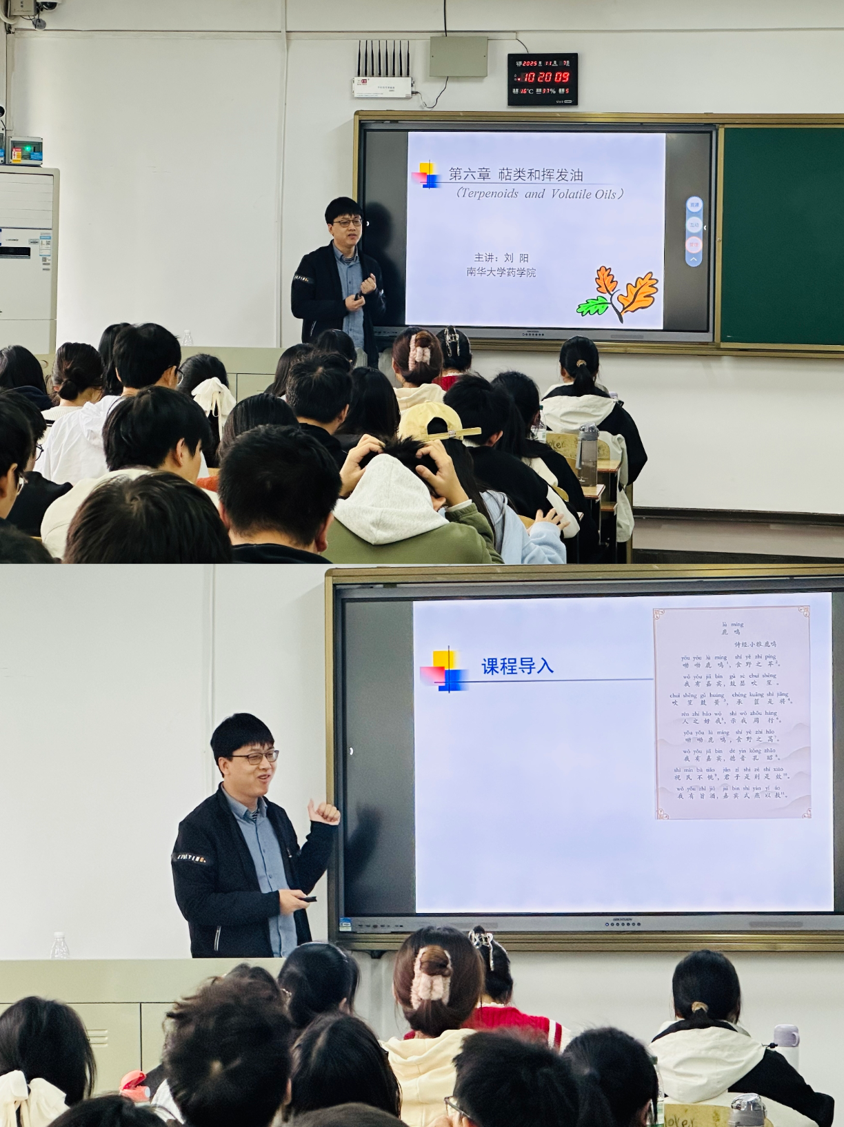 在课堂上,刘阳老师以屠呦呦与青蒿素的发现、提取、结构鉴定和修饰为思政导入,不仅提高了学生的学习兴趣,同时提高了学生为国研药的使命感和自豪感。通过深度融合生活中的实际天然植物和药品案例,系统介绍了萜类化合物的定义、分类和合成路径,重点阐述了单萜、倍半萜、二萜和二倍半萜化合物的结构特点、理化性质、代表性化合物及生物活性。通过系统讲解,学生不仅掌握了萜类化合物的核心知识,也为后续甾体类、生物碱类等其它天然药物化学的学习奠定了基础。